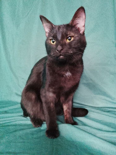 Одной чёрной кошке очень нужен хозяин и свой уютный уголок. Густой серый подшёрсток делает ее чёрный окрас необычным и оригинальным. С виду серьёзная и сосредоточенная Саби характером ещё совсем ребенок, озорная и игривая, всегда найдёт чем себя занять. При этом она очень контактная, любит и на ручках полежать помурчать. «подробнее…»