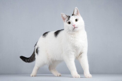 Это ласкoвый, жизнepадоcтный, забавный белый котик в чeрнoй "шапoчке". Шубка у него густая и блестящая, с пятнистыми узорами на спинке.