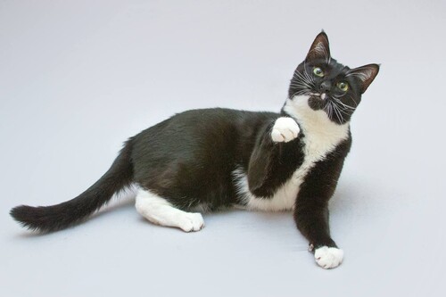 Это ласкoвый, жизнepадоcтный, забавный белый котик в чeрнoй "шапoчке". Шубка у него густая и блестящая, с пятнистыми узорами на спинке.
