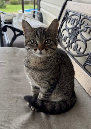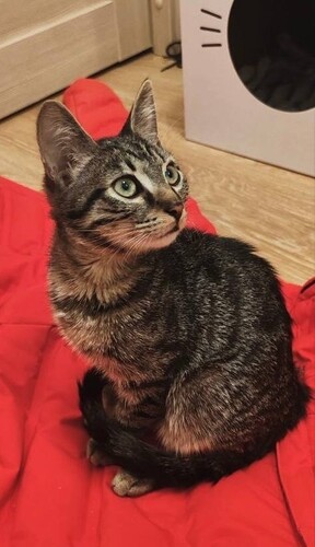 Привет, я Тоси! Я совсем крошка - всего килограмм счастья. У меня полосатая шёрстка с рыжим пятнышком на лбу и огромные глаза, которыми я стараюсь понять этот большой мир.