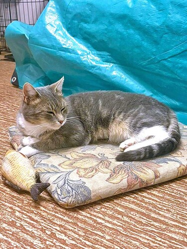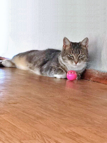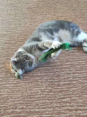 Мэй обожает игрушки и сама зовёт играть — очень общительная малышка! Можно гладить, брать на руки (на пару секунд — пока только привыкает), не агрессивна и быстро адаптируется к новой обстановке.