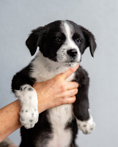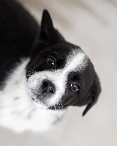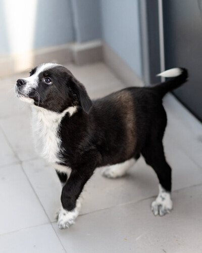Кроха - Чижик. Он весит сейчас примерно 4 кг. ему не больше 2- месяцев. Мальчик. Очень симпатичной расцветки. Белый с черным. Скорее всего будет крупным (в районе 20 кг), но не гигантом. Привит, здоров, жизнерадостен, не пуглив. Очень стремится к общению с человеком. Классный малец!