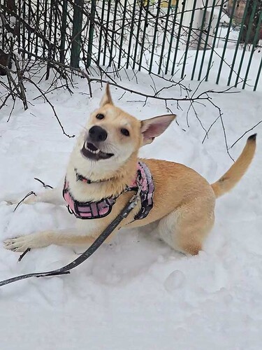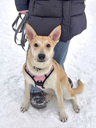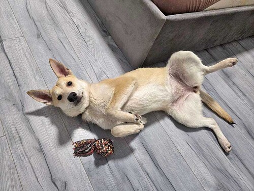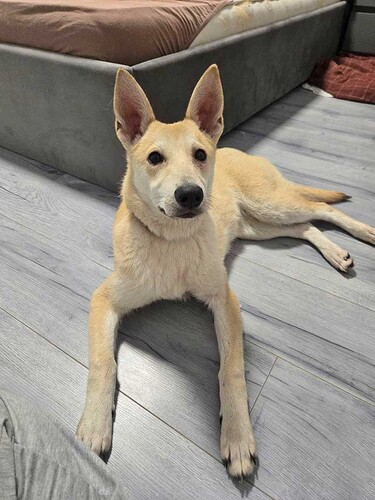 Чапе всего 6–8 месяцев, она ещё щенок — 14 кг любопытства, ума и чистой любви. Та самая собака, которая смотрит в глаза так, будто всё понимает. И, честно… она правда очень умная.