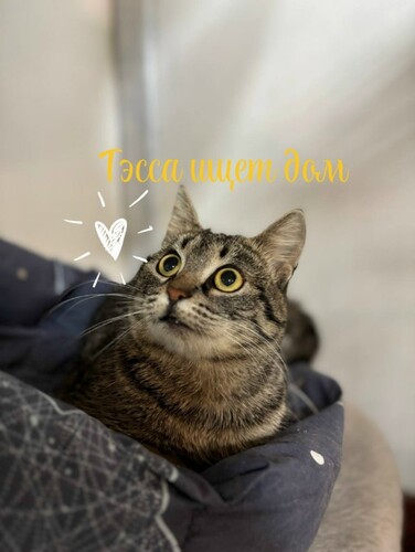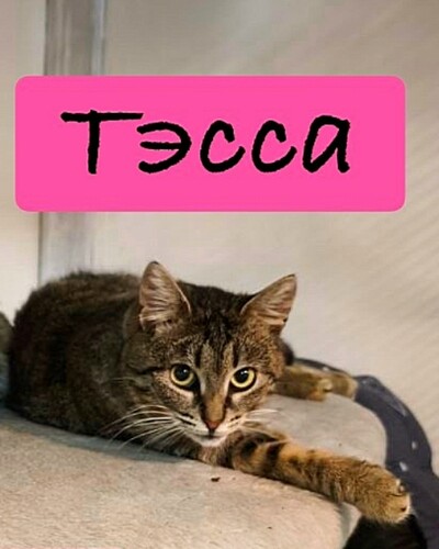 Тэсса жила у метро Парнас под ларьками с шавермой (типичная петербургская кошь), но их снесли. Волонтёры спасли кошку, нашли передержку, после которой кошка переехала к нам в приют. Пока Тэсса жила в клетке, казалась очень дикой: шипела, бросалась на руку. Но когда подошло время знакомиться с «этой вашей наружей», произошло удивительное для дичка преображение: выйдя из клетки, кошка не забилась в самый дальний угол вольера, а спокойно сидела у ног волонтёра, потом «поздоровалась» с остальными котожителями, нашла себе удобное местечко и легла. Поела, попила в скором времени, стресса — ноль. Кажется, всё, что нужно было Тэссе — чуть больше свободы. Конечно, ручной она волшебным образом не стала, но с ней можно поиграть удочкой, вполне контактная девчонка. Отлично ладит с котиками, спит со всеми в обнимку