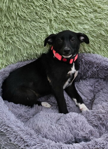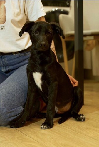 Черненькая с белыми лапками Герда ищет дом. Для этого возраста малышка совсем небольшая и вырастет красивой собачкой маленького размера.
